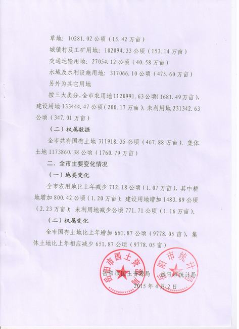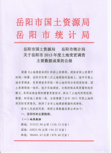岳阳市国土资源局 岳阳市统计局关于岳阳市2013年度土地变更调查主要数据成果的公报
