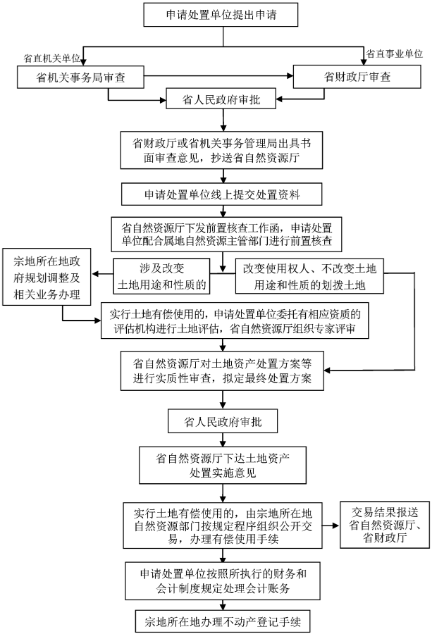 (一)处置事项线上办理。省直管土地资产处置事项申报、受理、核查、审批等程序通过省直管土地资产管理信息系统全流程线上办理。