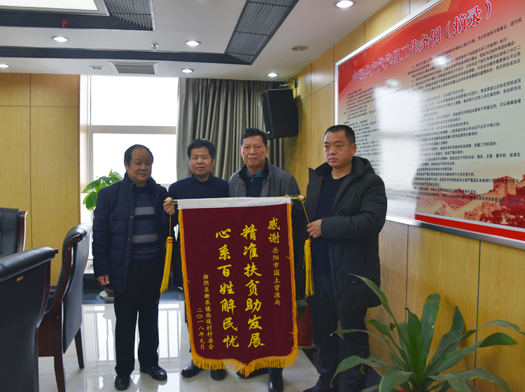 近日,湘阴县新泉镇西堤村村干部代表当地村民给市局送来了“精准扶贫助发展,心系百姓解民忧”锦旗,感谢市国土资源局一直以来对西提村的大力帮扶。