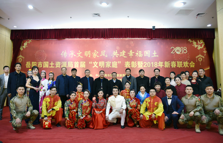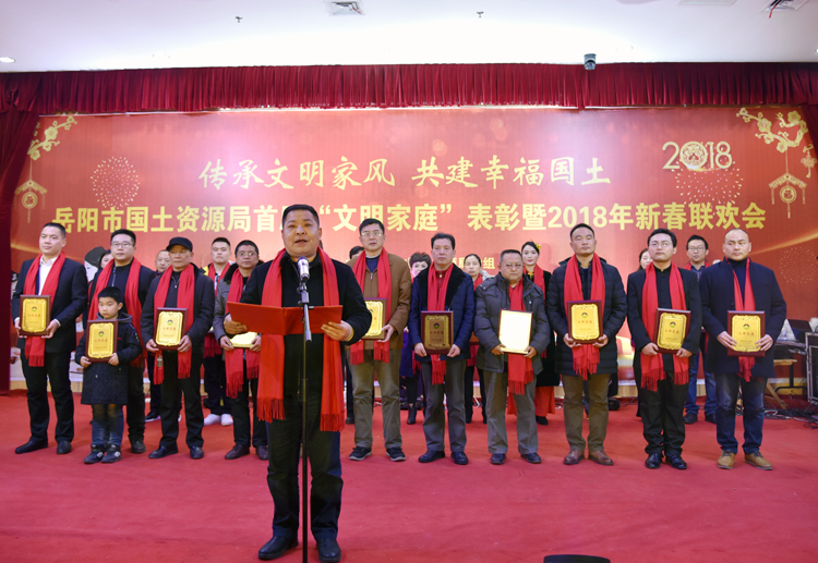 金鸡报捷去,锦犬送春来。2月7日晚,市局一楼会议室喜气洋洋,热闹非凡,岳阳市国土资源局首届“文明家庭”表彰暨2018年新春联欢会在这里举行,市局党组书记、局长胡辉,局领导易拓新、刘险峰、严菲、彭四林、李志宏、陈湘栋、周治中与全体干部职工及其家属200余人欢聚一堂,喜迎新春。