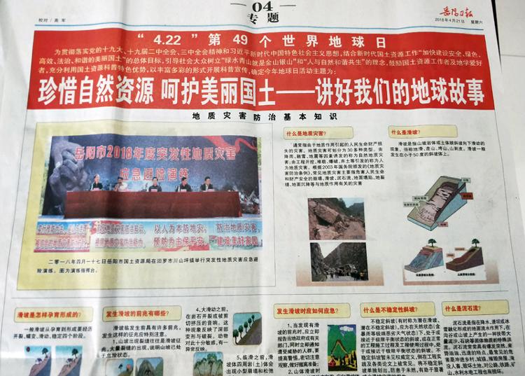 二是加大宣传力度,扩大社会影响。4月21日,在岳阳日报整版刊登了世界地球日图文宣传知识,24日、25日,又在岳阳电视台新闻频道分别4次播放了开展世界地球日主题宣传系列活动新闻。除了利用电视、报刊等新闻媒体外,还通过微信、微博方式,推出围绕地球日主题的系列宣传,以生动的形式宣传、报道了地球日的相关信息,扩大了地球科学知识的社会影响面。