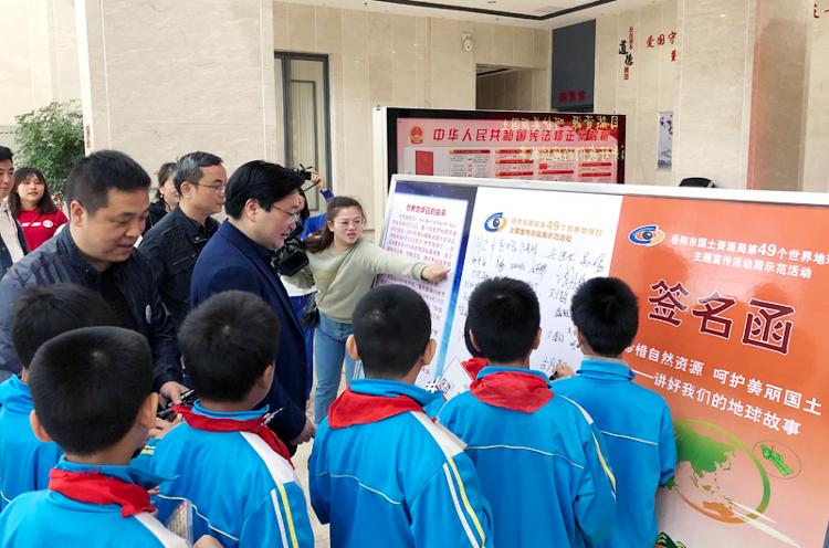 三是创新活动形式,注重宣传实效。4月23日,由岳阳市国土资源局主办、岳阳市国土资源局南湖新区分局和区教育文体科技局协办的“地学科普基地开放日”活动在岳阳市地理信息展厅举办。市国土资源局党组成员、机关党委书记周治中,市国土资源局地环科、市地理信息中心、南湖新区国土分局相关负责人,以及金鹗小学学生代表等近200余人参加活动。学生们通过“看”图文并茂的陈列展品、“听”生动有趣的讲解陈述、“学”地球地学基础知识、“答”有奖知识竞答、“签”地球保护承诺等活动,树立起从小珍惜资源、保护地球环境的意识。