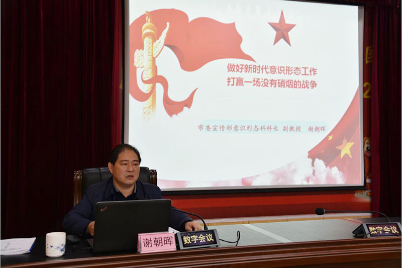 活动还邀请了市委宣传部意识形态科科长谢朝晖作《做好新时代意识形态工作 打赢一场没有硝烟的战争》专题辅导。谢朝晖从习近平总书记关于意识形态工作的重要论述、新时代意识形态工作的地位、当前意识形态领域面临的风险挑战、落实意识形态工作责任制存在的问题及如何以落实责任制为抓手推动意识形态工作等几个方面,进行了系统全面的讲授,内容丰富,事例生动,专业性强,具有很好的启发和指导作用。
