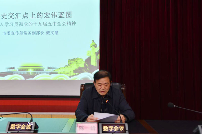 12月25日下午,市局组织党组中心组第七次集中(扩大)学习暨党的十九届五中全会精神集中宣讲报告会,邀请市委宣讲团成员、市委宣传部常务副部长戴文慧进行党的十九届五中全会精神解读集中宣讲。会议由局党组书记、局长陈峰主持,局党组全体班子成员、调研员、全体机关干部、直属单位正科职以上干部参加会议。