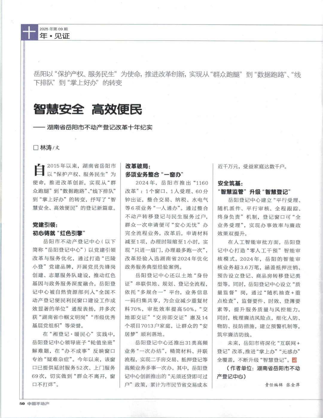 自 2015 年以来,湖南省岳阳市以“保护产权、服务民生”为使命,推进改革创新,实现从“群众跑腿”到“数据跑路”、“线下排队”到“掌上好办”的转变,抒写了“智慧安全、高效便民”的登记新篇章。