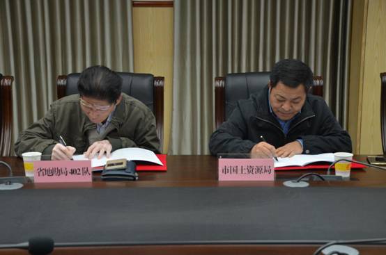 市国土资源局党组书记、局长胡辉,党组成员、总工程师李志宏和湖南省地质矿产勘查开发局402队党委书记周亚松等领导参加了签约仪式。