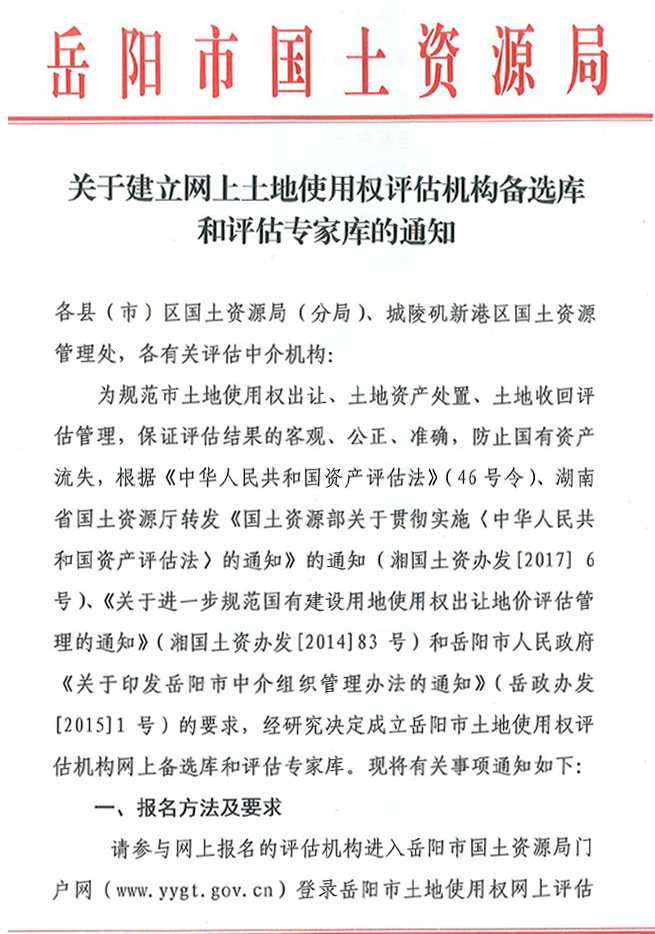关于建立网上土地使用权评估机构备选库和评估专家库的通知