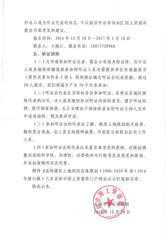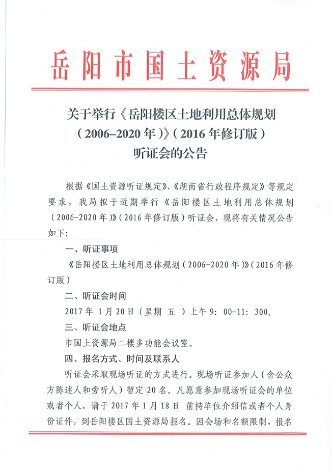 关于举行《岳阳楼区土地利用总体规划(2006-2020)》(2016年修订版)听证会的公告