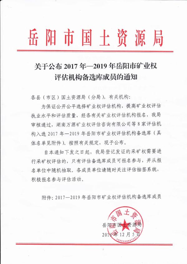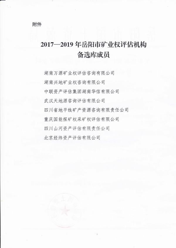 关于公布2017年-2019年岳阳市矿业权评估机构备选库成员的通知