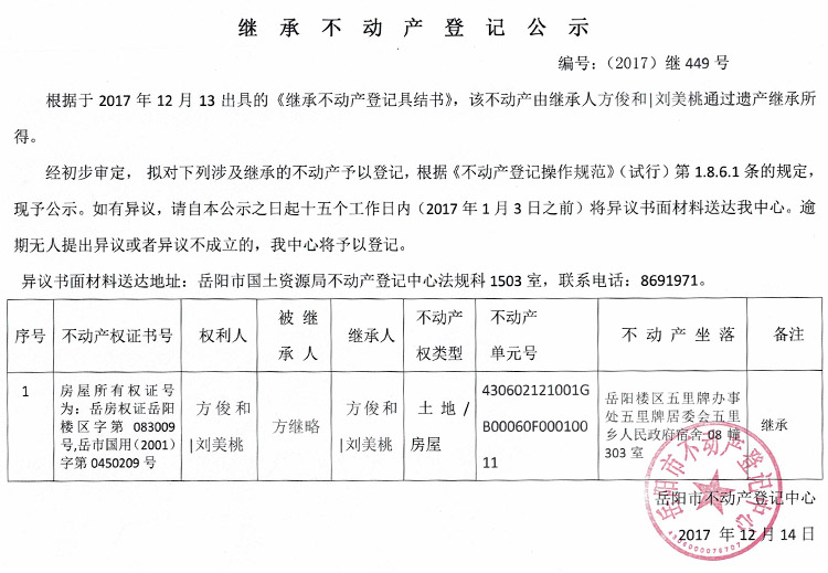 继承不动产登记公示 编号:(2017)继449号