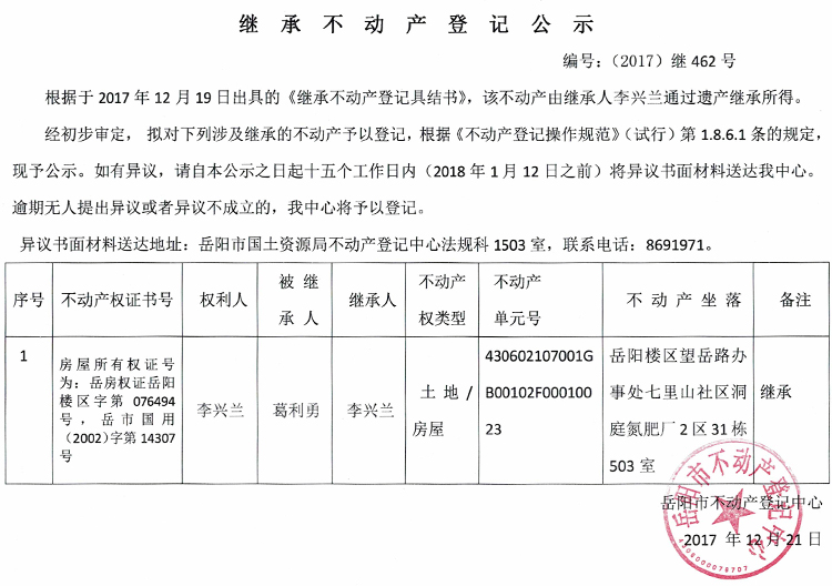 继承不动产登记公示 编号:(2017)继462号