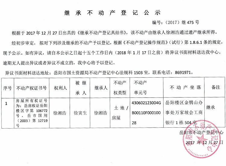 继承不动产登记公示 编号:(2017)继475号