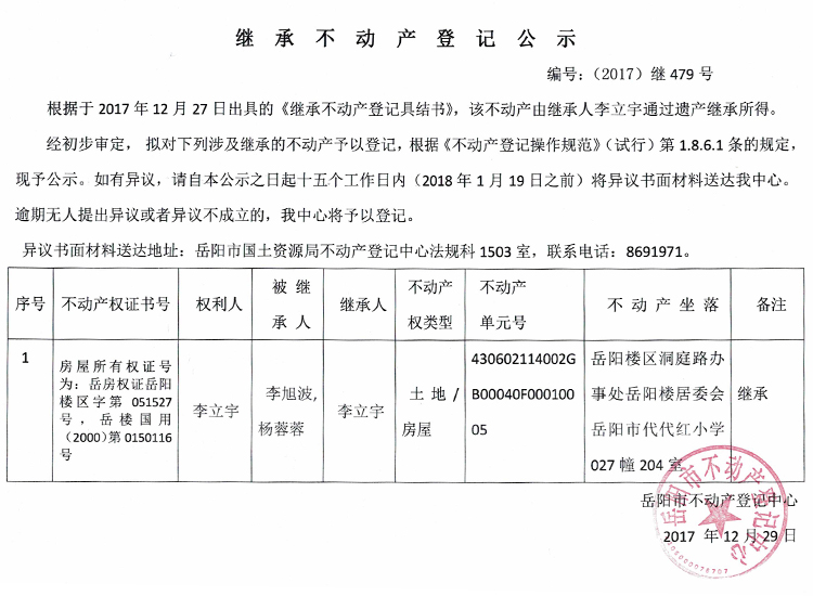 继承不动产登记公示 编号:(2017)继479号