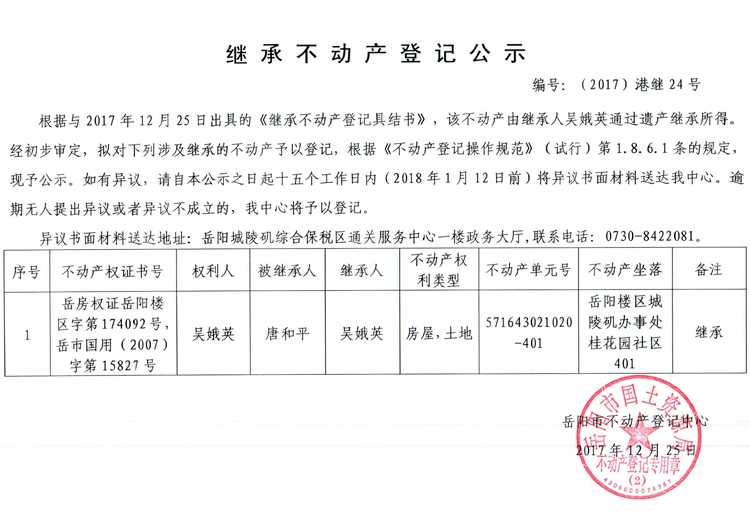 继承不动产登记公示(2017)港继24号
