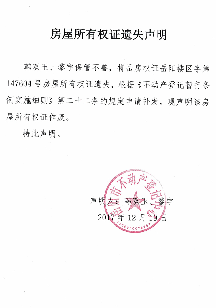 房屋所有权证遗失声明(韩双玉、黎宇)