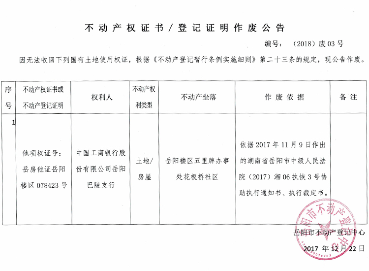 不动产权证书/登记证明作废公告 编号:(2018)废03号
