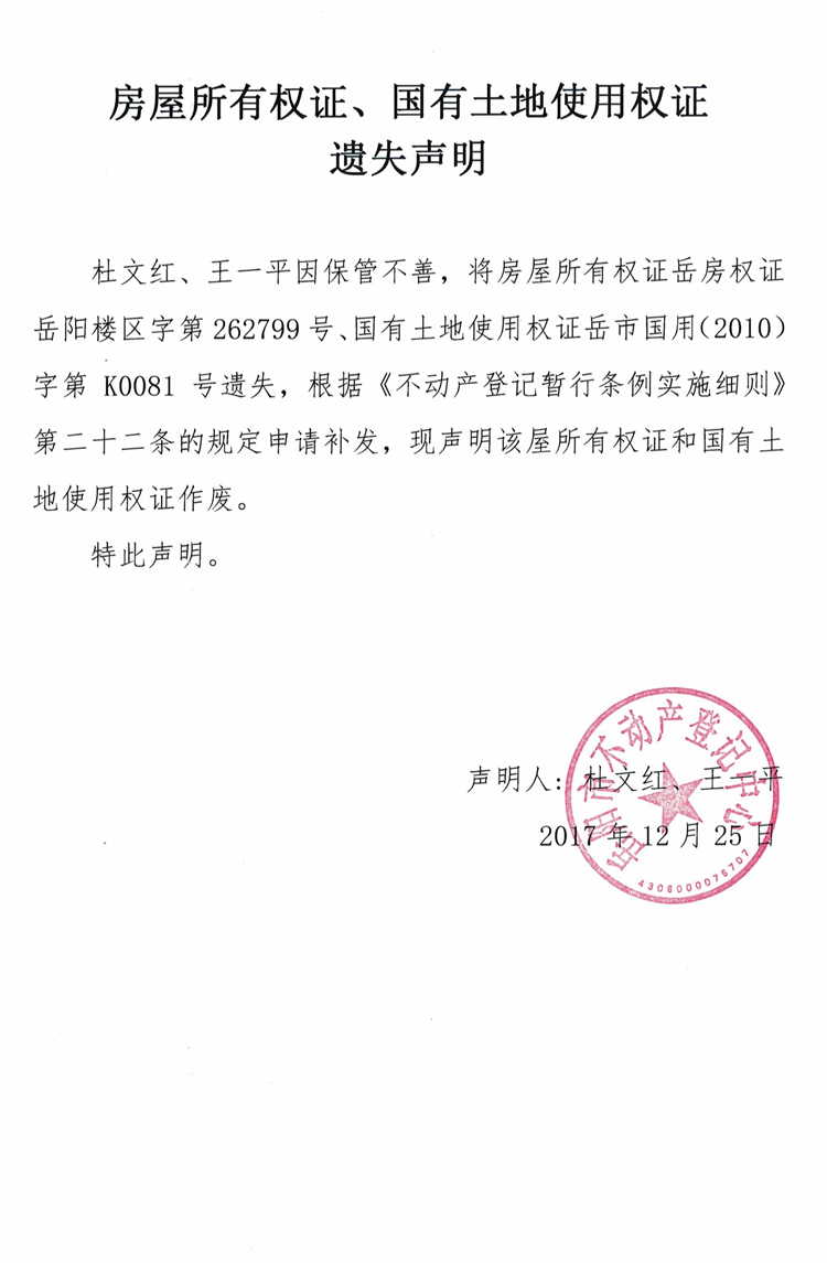 房屋所有权证、国有土地使用权证遗失声明(杜文红、王一平)
