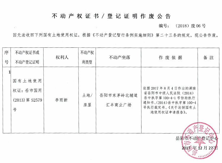 不动产权证书/登记证明作废公告 编号:(2018)废06号