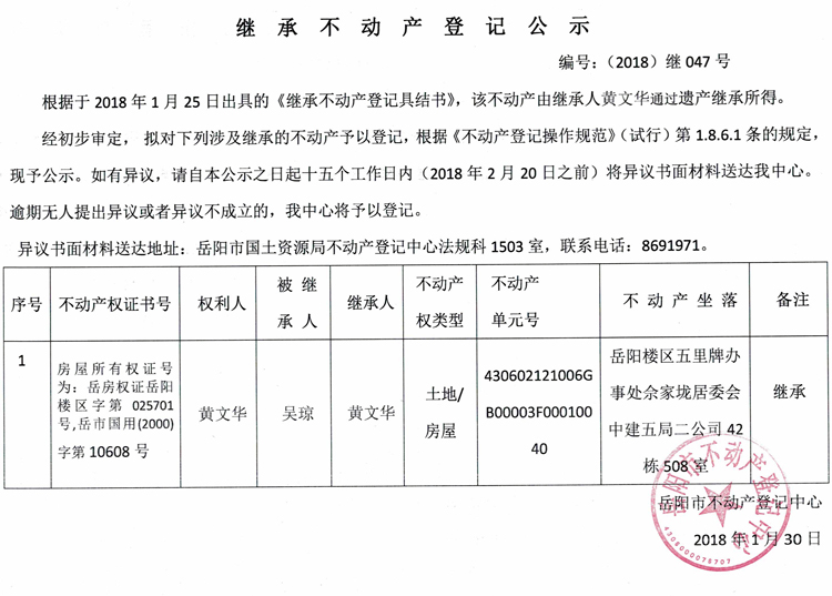 继承不动产登记公示 编号:(2018)继047号