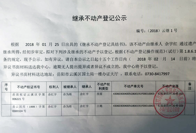 继承不动产登记公示(2018)云继1号