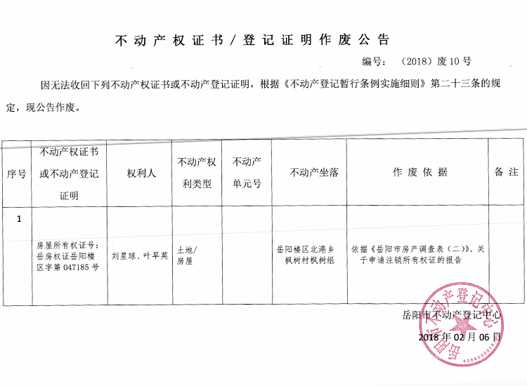 不动产权证书/登记证明作废公告 编号:(2018)废10号