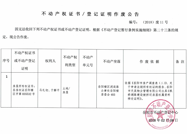 不动产权证书/登记证明作废公告 编号:(2018)废11号