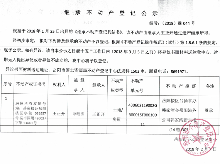 继承不动产登记公示 编号:(2018)继044号