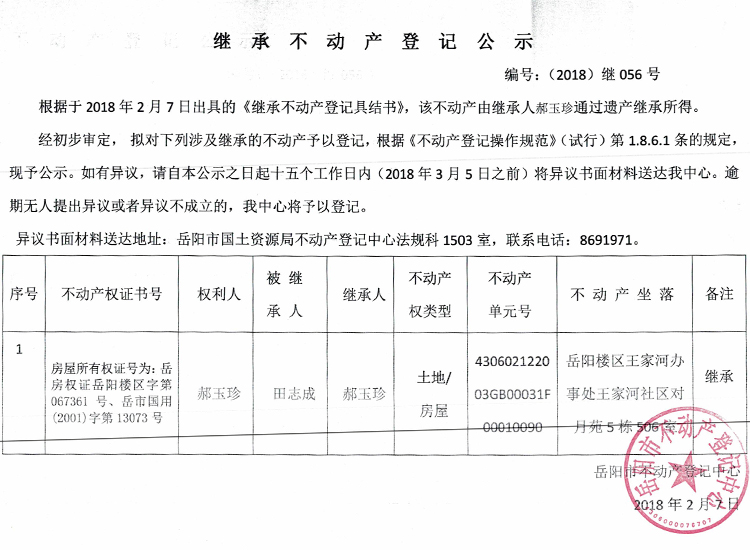 继承不动产登记公示 编号:(2018)继056号