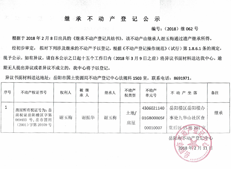 继承不动产登记公示 编号:(2018)继062号
