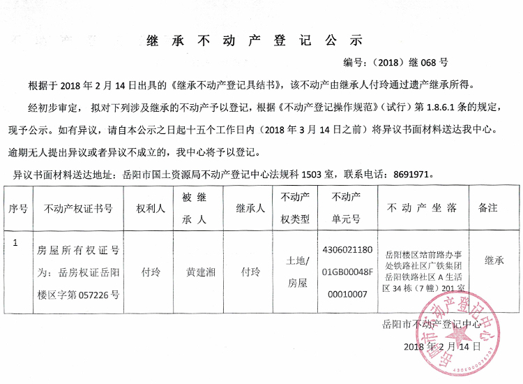 继承不动产登记公示 编号:(2018)继068号