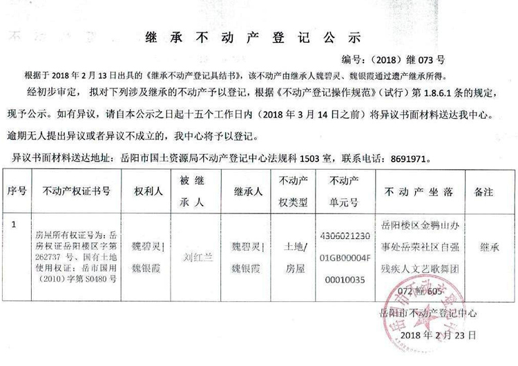 继承不动产登记公示 编号:(2018)继073号