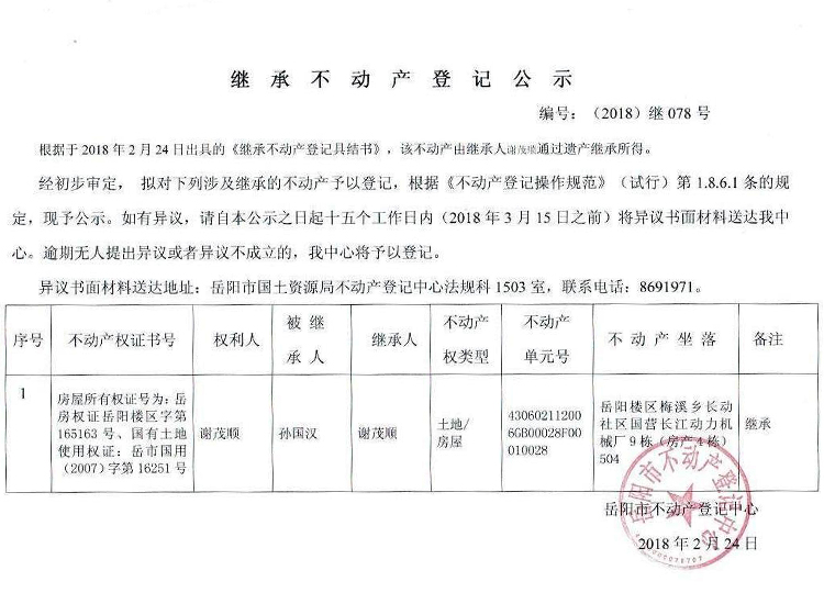 继承不动产登记公示 编号:(2018)继078号