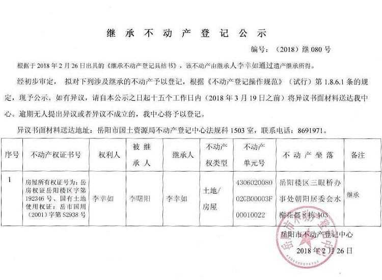 继承不动产登记公示 编号:(2018)继080号