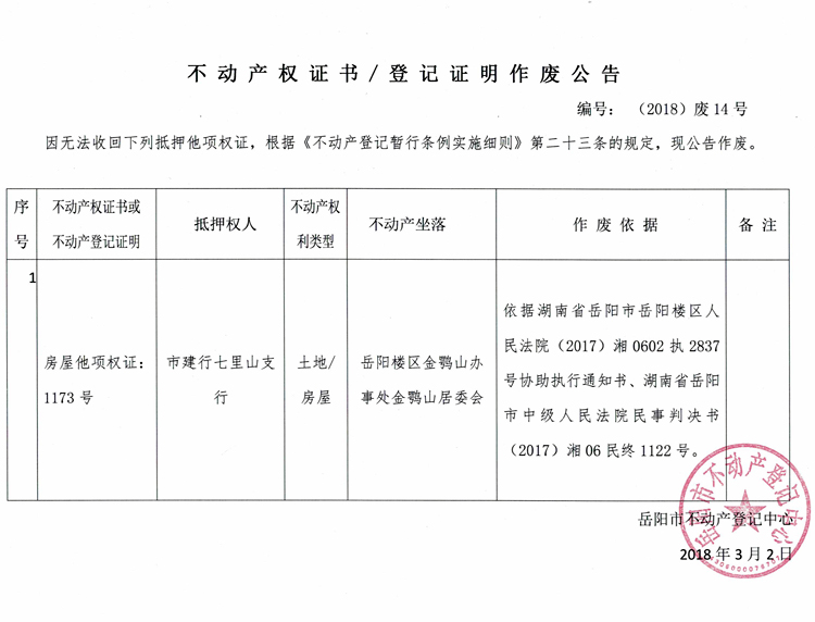 不动产权证书/登记证明作废公告 编号:(2018)废14号