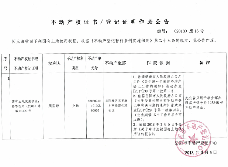 不动产权证书/登记证明作废公告 编号:(2018)废16号