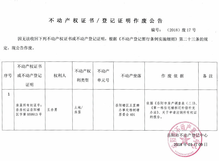 不动产权证书/登记证明作废公告 编号:(2018)废17号