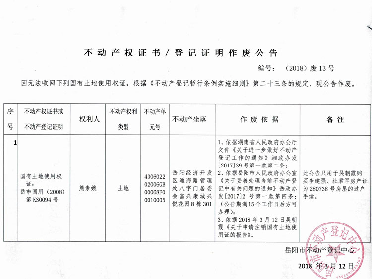 不动产权证书/登记证明作废公告 编号:(2018)废13号