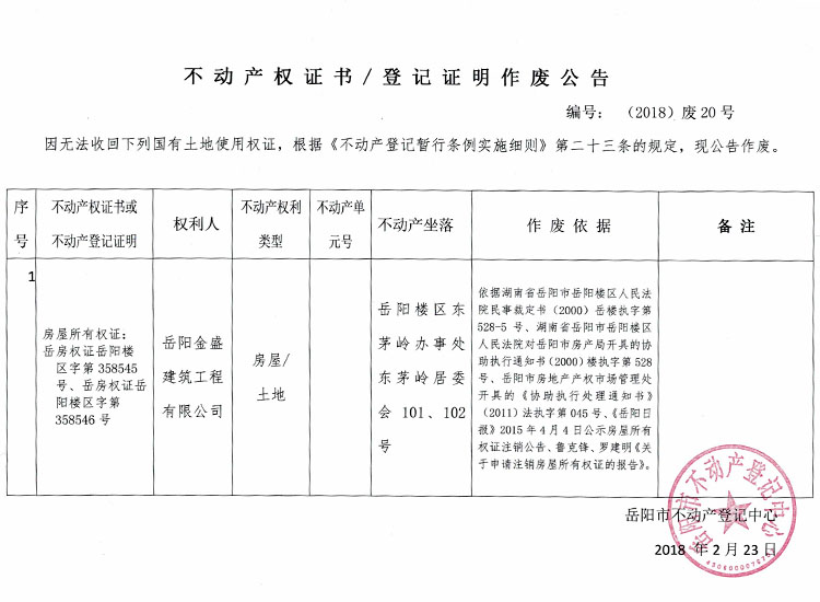不动产权证书/登记证明作废公告 编号:(2018)废20号