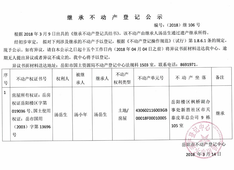 继承不动产登记公示 编号:(2018)继106号