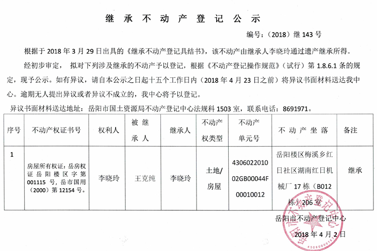 继承不动产登记公示 编号:(2018)继143号