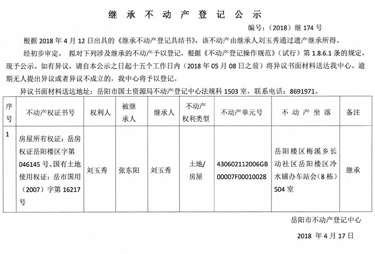 继承不动产登记公示 编号:(2018)继174号