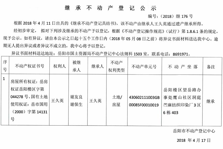 继承不动产登记公示 编号:(2018)继176号