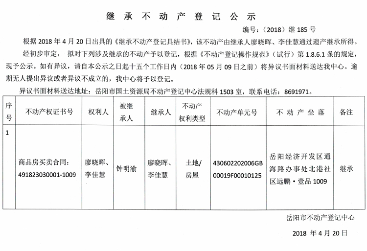 继承不动产登记公示 编号:(2018)继185号