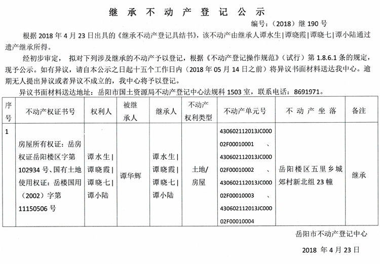 继承不动产登记公示 编号:(2018)继190号