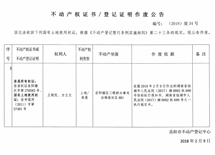 不动产权证书/登记证明作废公告 编号:(2018)废34号