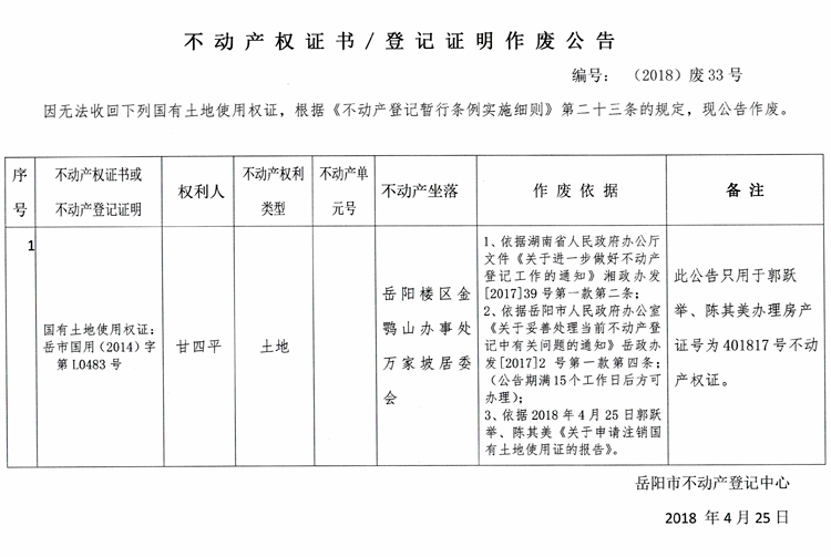 不动产权证书/登记证明作废公告 编号:(2018)废33号
