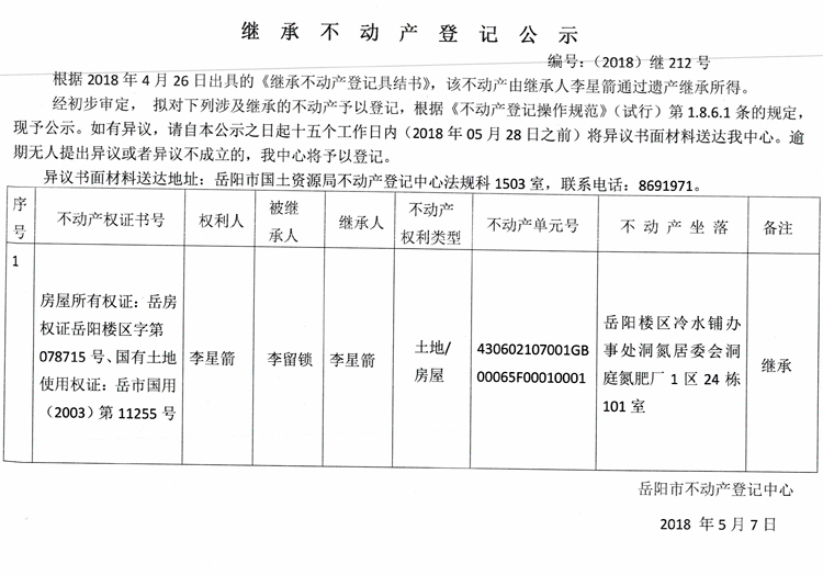 继承不动产登记公示 编号:(2018)继212号