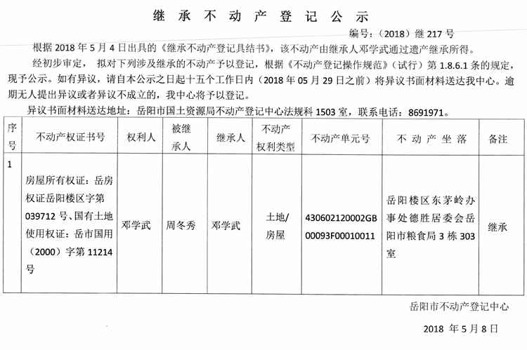继承不动产登记公示 编号:(2018)继217号(邓学武)