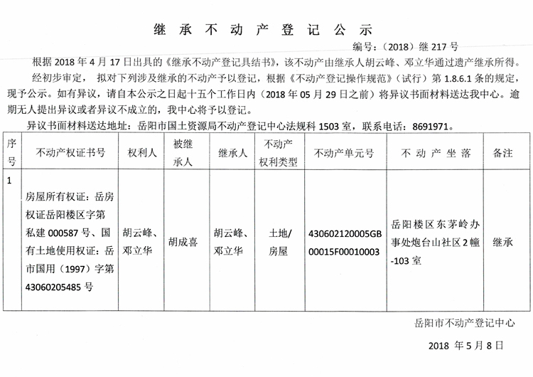 继承不动产登记公示 编号:(2018)继217号(胡云峰)