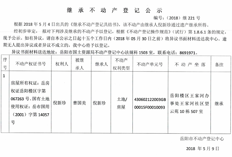 继承不动产登记公示 编号:(2018)继221号